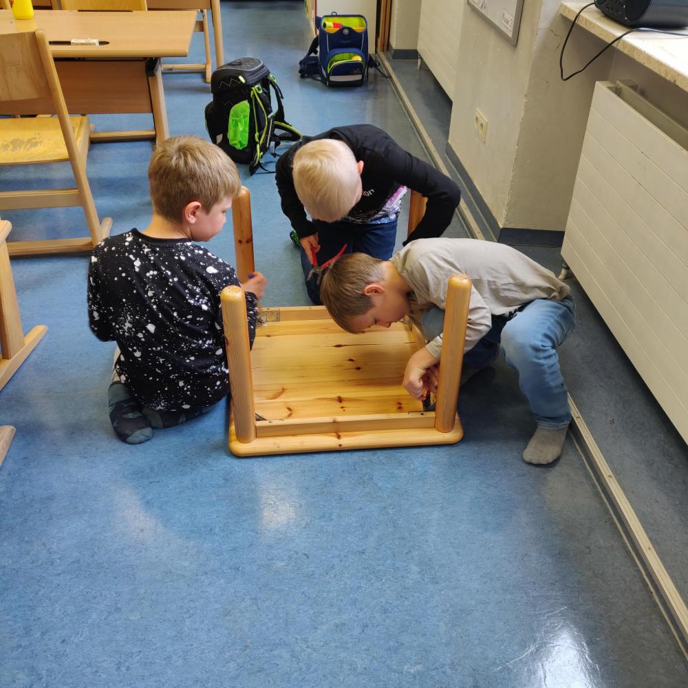 Es wird mit Lego gebaut.Die Kinder zeigen sich gegenseitig den Umgang mit den Tablets.Die Kinder reparieren den Tisch.