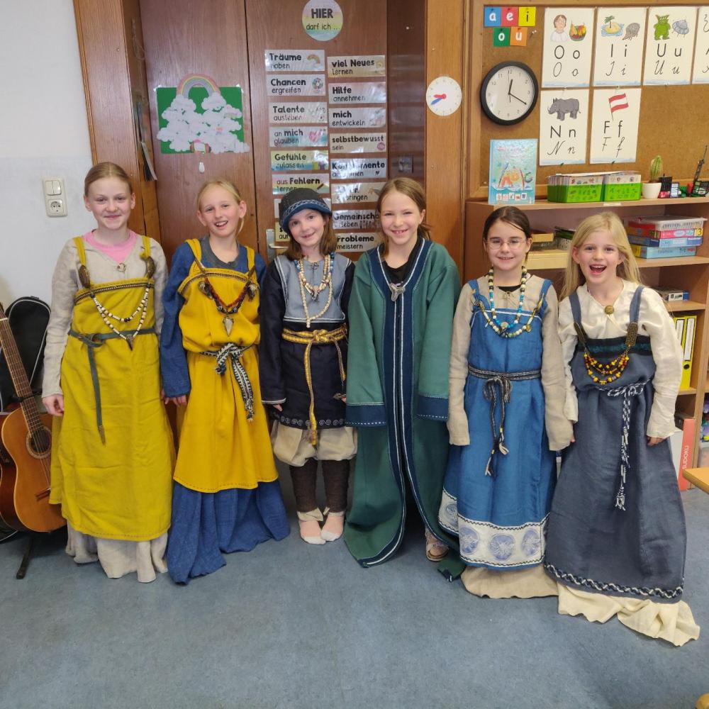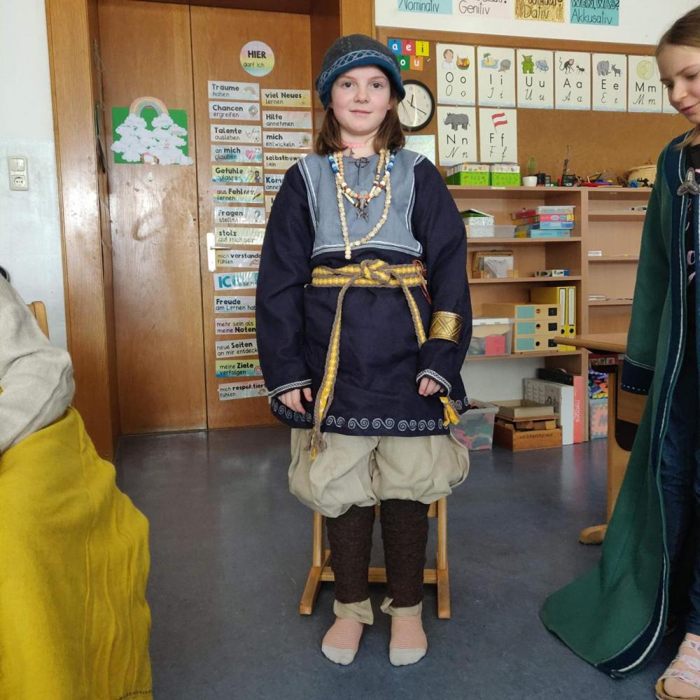 Frau Lehrerin Bianca brachte uns aus ihrem Fundus an Wikingerkleidung etwas mit und wir durften es sogar anziehen.