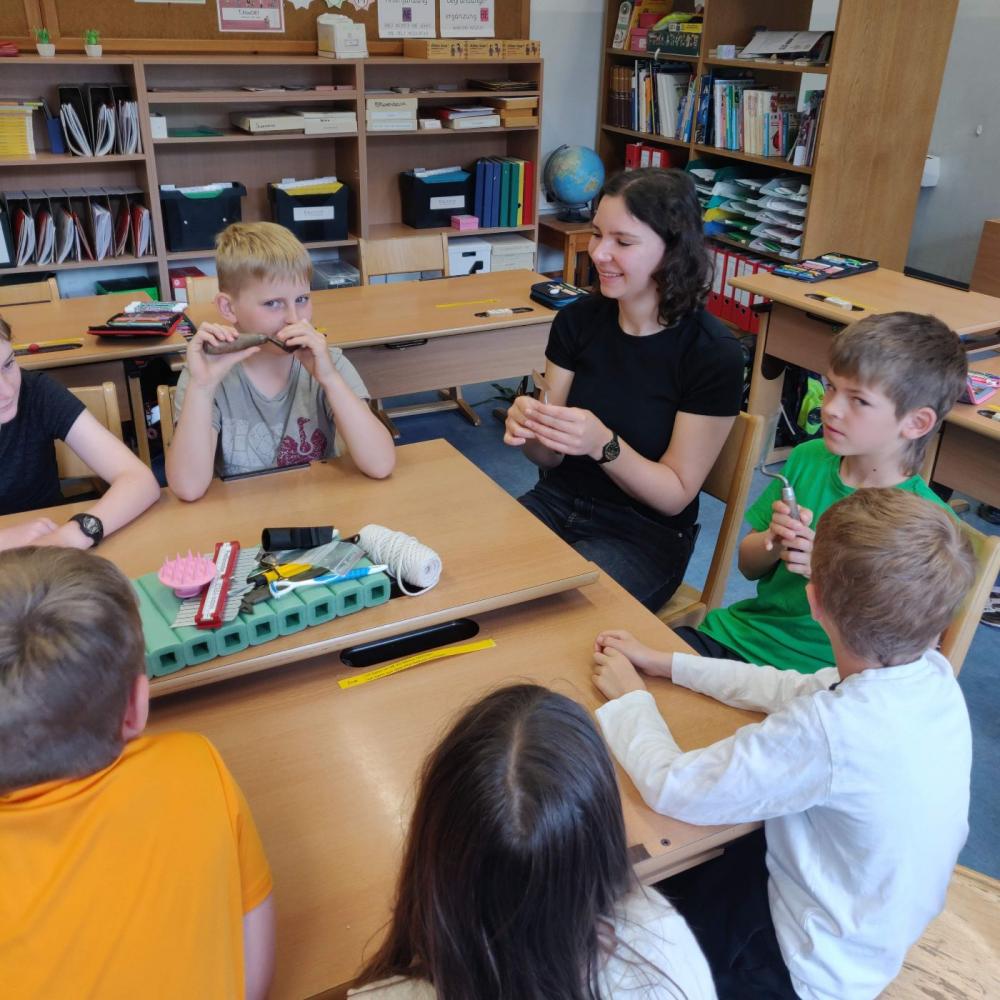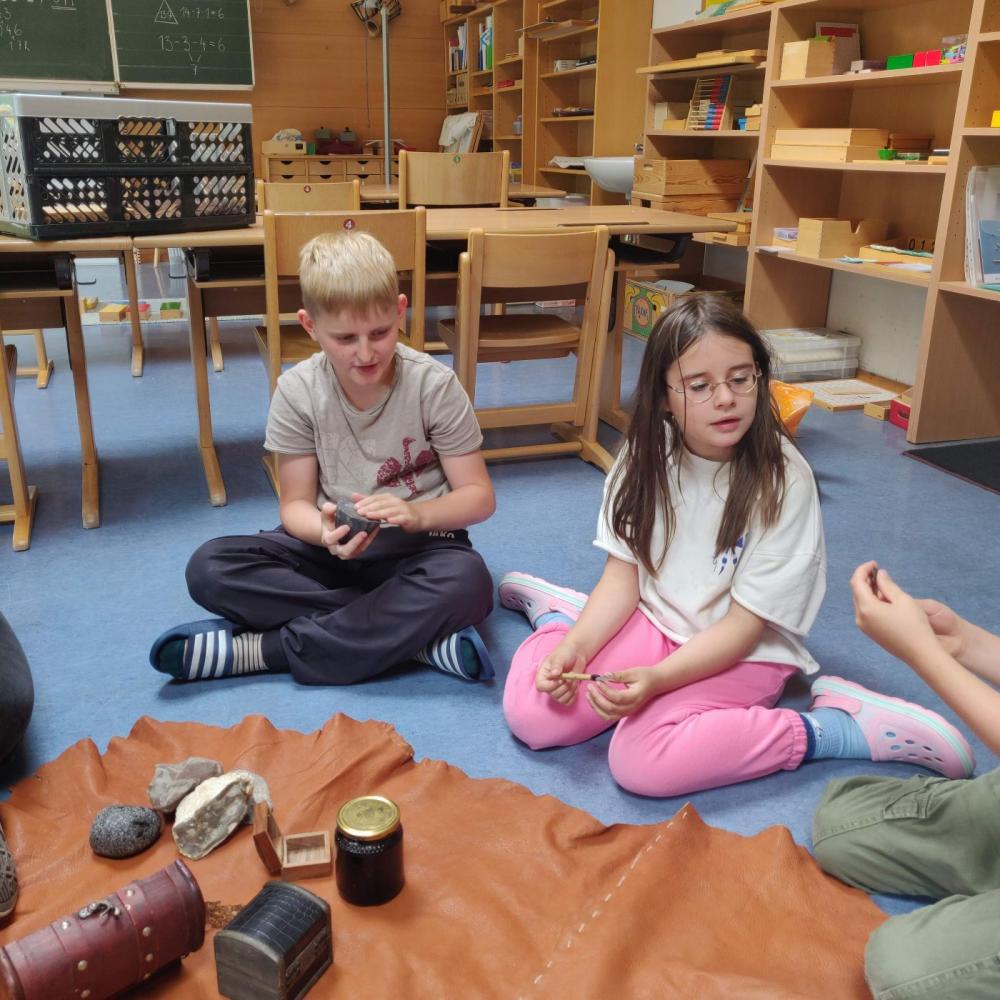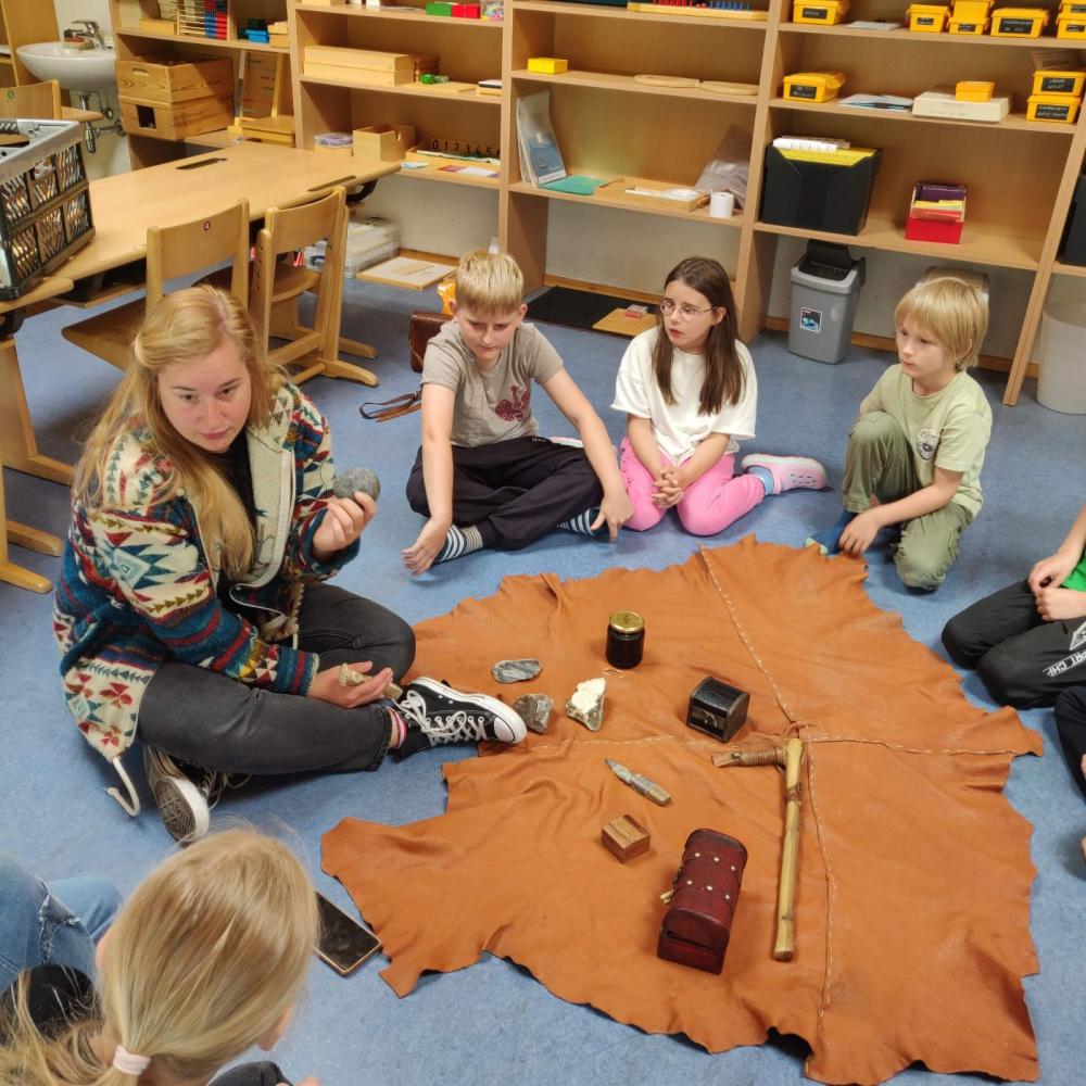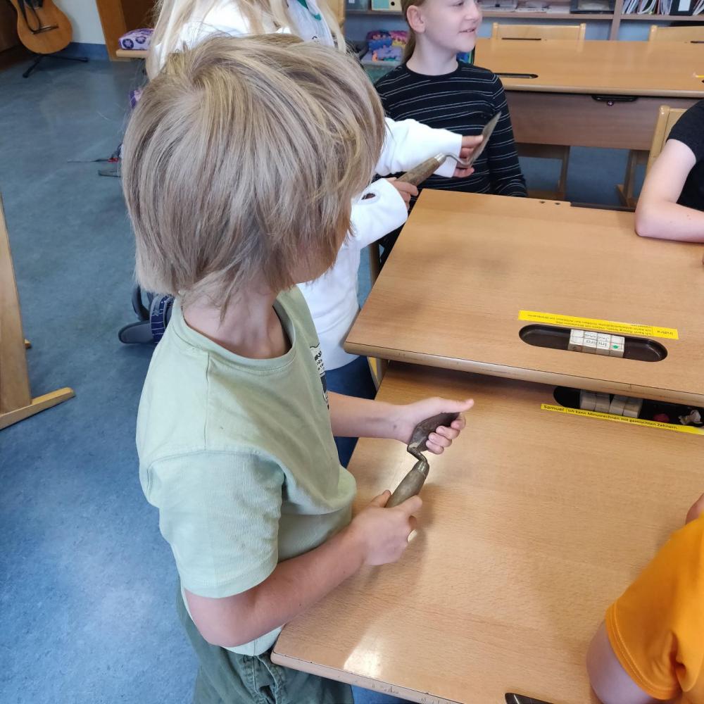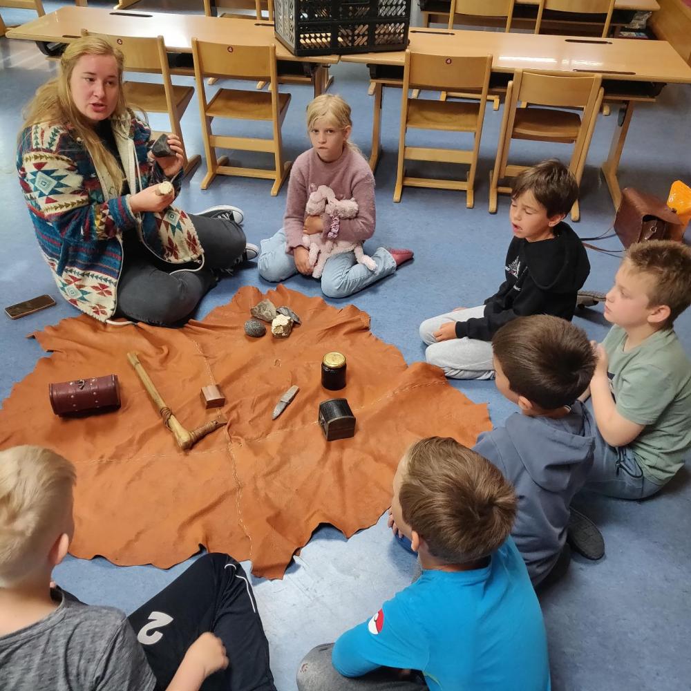 Wir hatten Besuch von zwei Archäologinnen von der Universität Innsbruck, Tamara und Julia. Sie zeigten uns Funde und erforschte Dinge, die sie in Tirol gefunden hatten. Wir durften die Sachen sogar angreifen. Das war sehr spannend.
